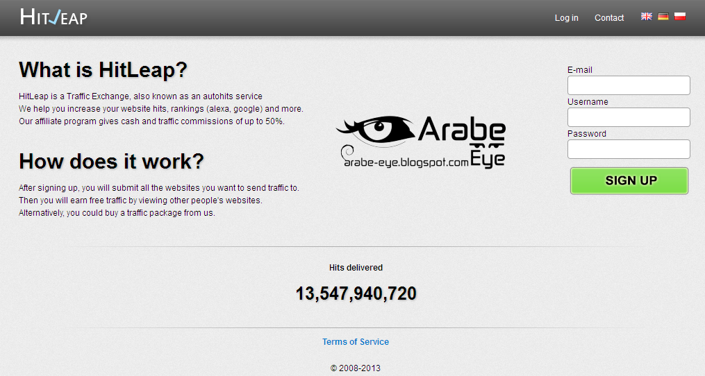 أحصل على مئات الزوار يوميا (زوار حقيقيين) (hitleap) السلام عليكم ورحمة الله وبركاته زوار المدونة الكرام من منا لا يبحث عن زوار لمدونته أو موقعه لا احد الكل يريد ان يزور موقعه مئات الزوار يوميا اليوم أتيتكم بموقع ممتاز للتبادل الزوار وزوار حقيقيين وليس وهميين ساشرح لكم كيفية عمل الموقع عند دخولك للموقع تضغط على تبادل الزيارات وعندها يبدأ العمل كلما تركت صفحة تبادل الزيارات مفتوحة كلما حصلت على زوار كثر اترككم مع الصور للتوضيح عند دخولك للموقع قم بالتسجيل التسجيل سهل فقط إملأ البيانات بما يجب تانيا عند إتمام تسجيلك كما ترى في الصورة قم بإضافة موقعك يمكنك إضافة أكثر من واحد إن أردت ذالك ثم انتبه لتلك الأرقام المحاطة باللون الاحمر 20s تمثل المدة التي سيبقاها الزوائر في موقعك و 100 تمثل عدد الزيارات التي ستتلقاها في كل ساعة تقريبا غير ذالك بما يناسبك بالضغط على الرقم لتغييره تالثا واخيرا كما في الصورة قم بالضغط على Traffic Exchange ثم قم بالضغط على Start traffic exchange بعدها ستنفتح صفحة منعزلة اتركها أو انساها فلا يهم ان تبقي عينيك عليها فقط اتركها وسترى نتائج في لمحة العين فكلما تركتها كسبت وقتا إضافيا يمكنك صرف في جلب زوار لمدونتك فمثلا لو أبقيت الصفحة مفتوحة لمدة 100 دقيقة ستحصل على 50 دقيقة من الزيارات لموقعك ويمكنك تقسيم 50 دقيقة على عدد التواني التي اخترتها في البداية وسترى على كم ستحصل الموقع جيد وسهل العمل للتسجيل إضغط هنا بالتوفيق للجميع